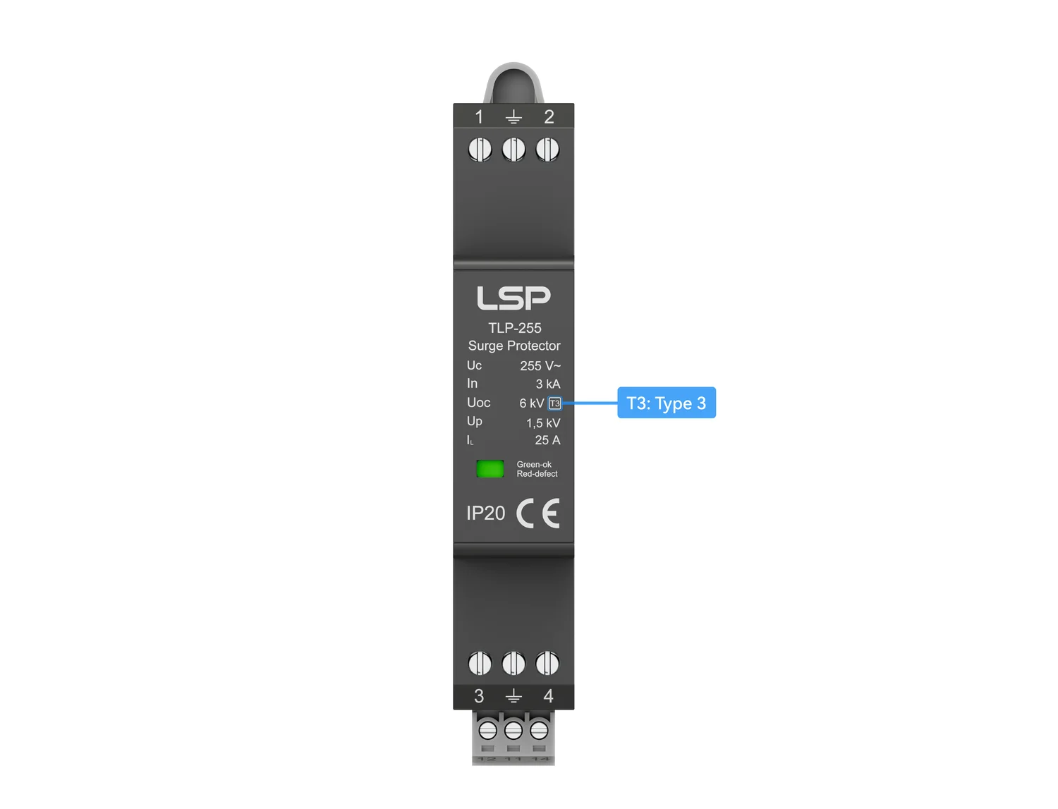 - Framed T3 – Signifies that the SPD has passed a Type 3 test, using a 1.2/50 µs voltage waveform, designed for fine protection of sensitive terminal equipment such as computers, appliances, or socket-level protection.