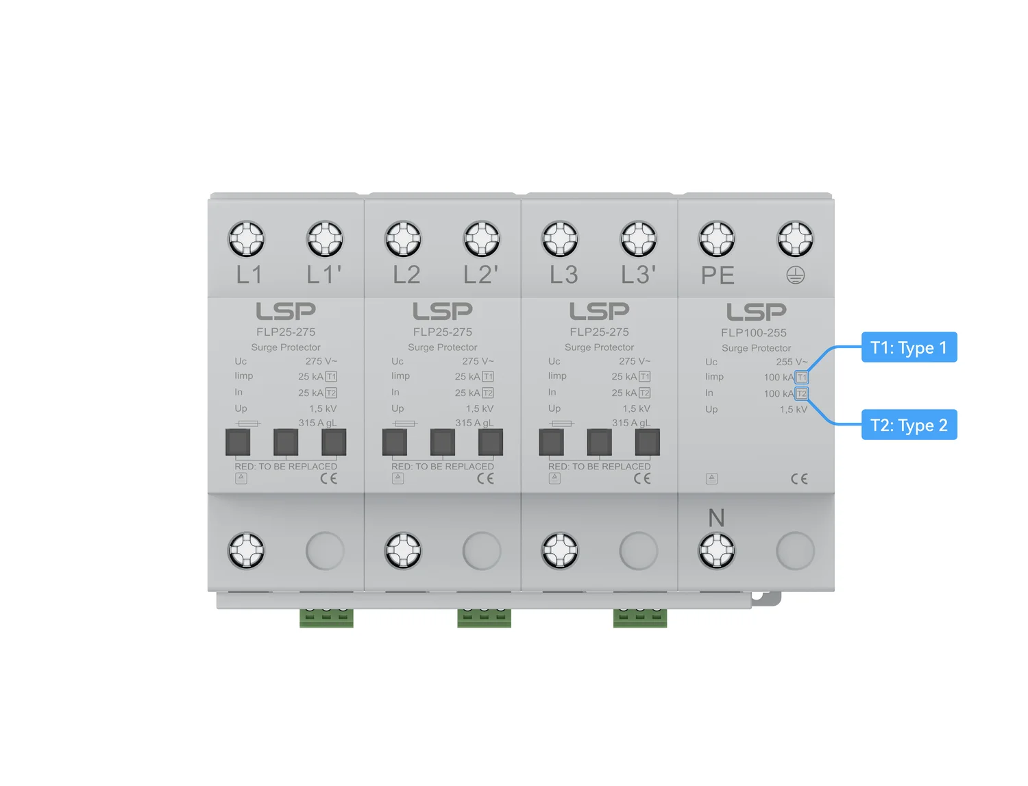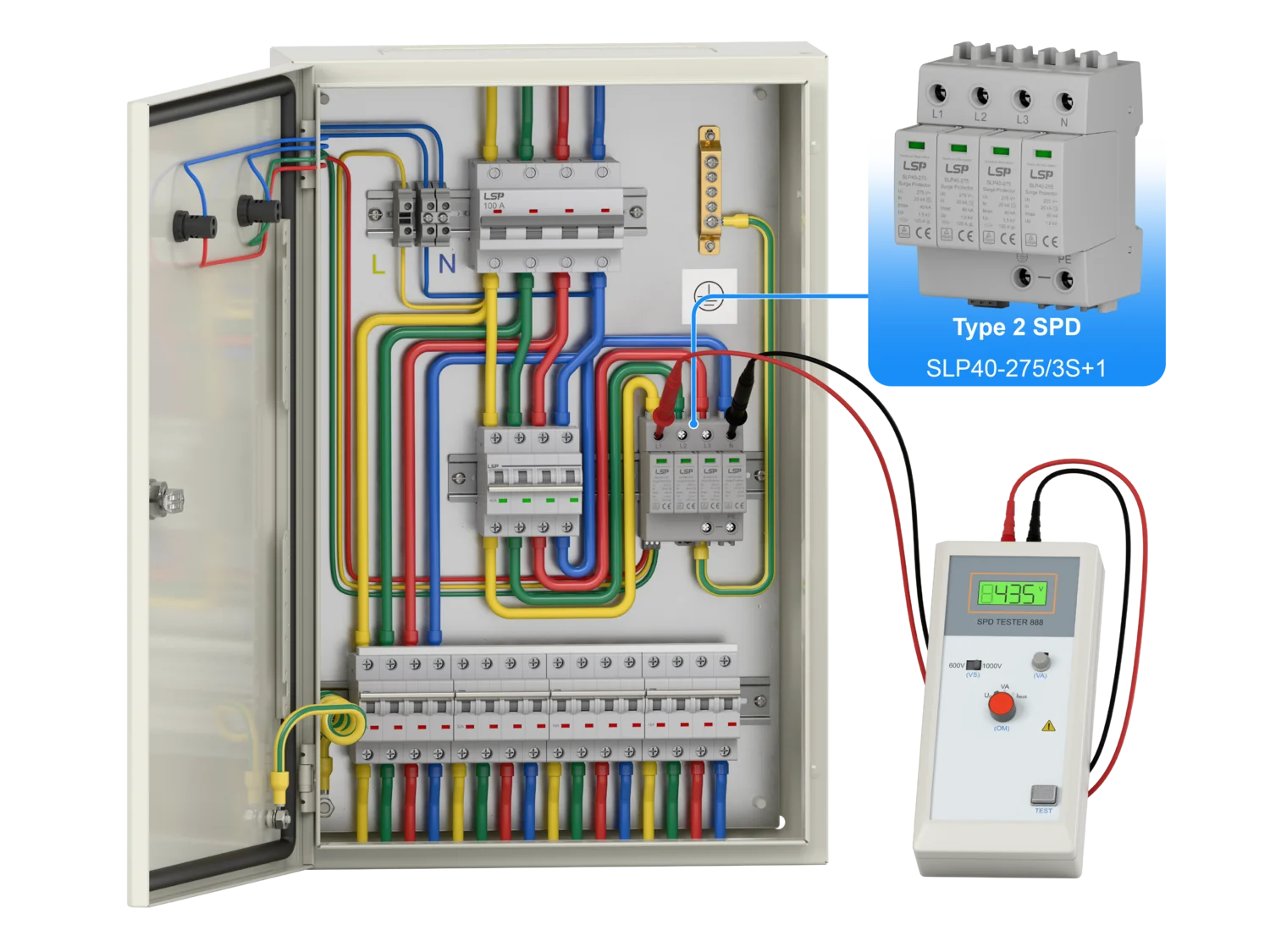 - Type 1 SPD: Installed at the main distribution level, capable of handling 10/350μs lightning current impulses.