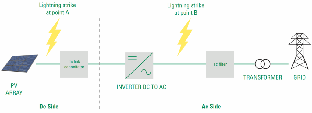 It is important to protect both AC & DC sides from lightning strikes by using a proper solar surge protection device.