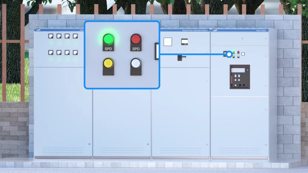 Before installing the SPD, turn off the upstream MCCB or MCB. During installation, follow the 50-centimeter installation rule. Connect the signal wire from the SPD’s floating switch to the red and green lights on the control panel, ensuring correct signal transmission.