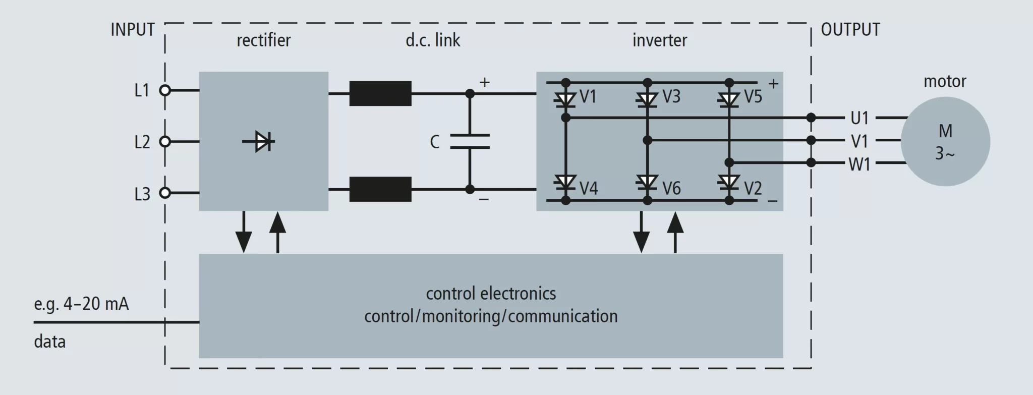 Tại đầu vào của bộ biến tần, điện áp xoay chiều một pha hoặc điện áp xoay chiều ba pha giữa các pha được chuyển đổi thành điện áp một chiều dao động và được đưa vào đường truyền một chiều (DC link), đồng thời cũng đóng vai trò như một hệ thống lưu trữ năng lượng (buffer).